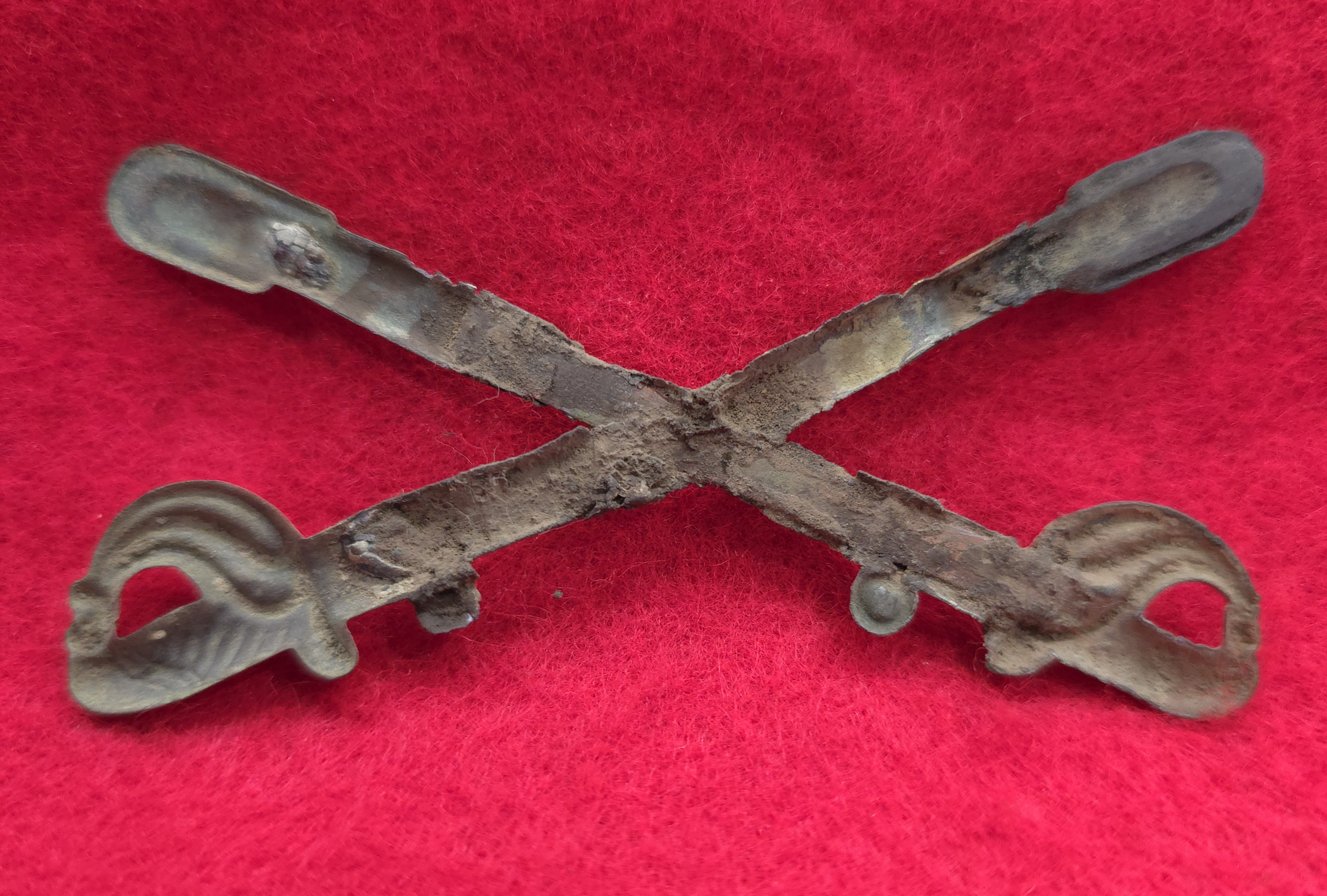 Cool Original Cavalry Crossed Sabers Hat Insignia. I personally dug this one in a General Earl VanDorn Confederate Cavalry camp. It came out of a fire pit that produced some nice Confederate relics. It was broken when I found it, and I had my good friend, Dr Robert McDaniel , restore it for me and it displays superbly , and is priced accordingly. Nice inexpensive relic for your collection .
