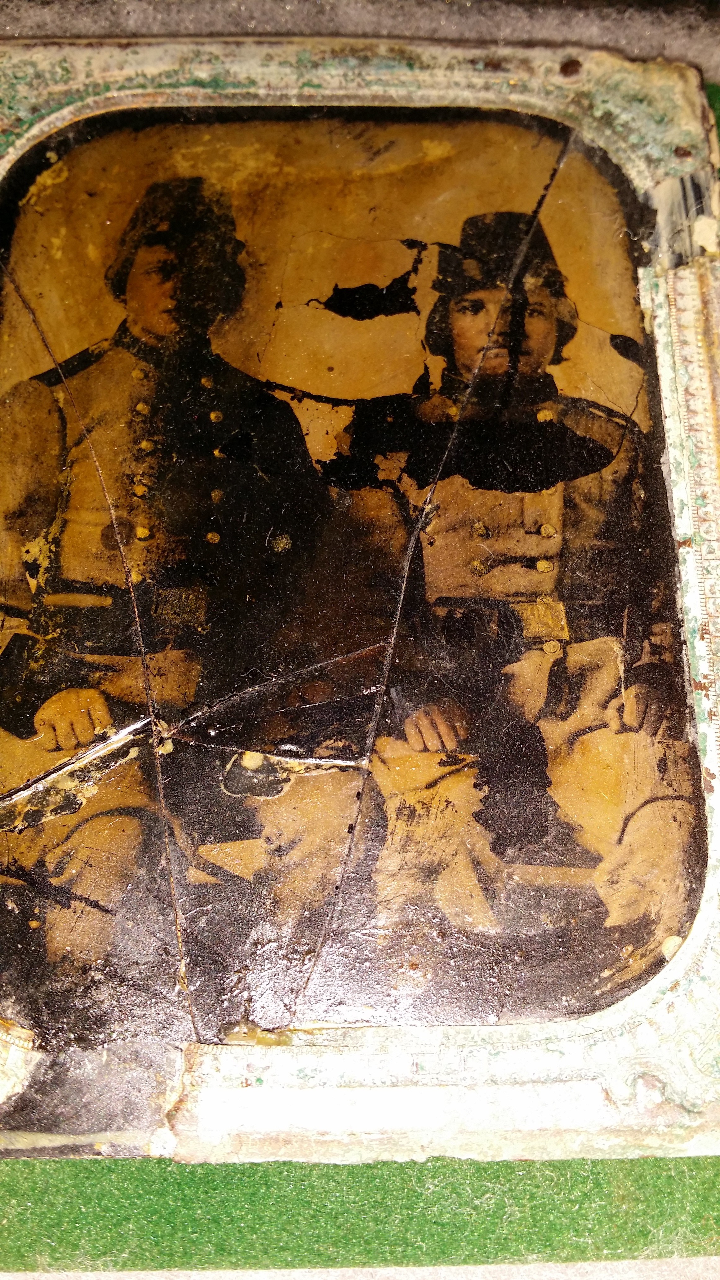 Very cool dug 6th plate size Ambrotype dug by Kenny Copeland in a Louisiana Infantry camp near Shelbyville Tennessee. This was dug with another Very famous Two Louisiana soldiers Ambrotype. I used to have the famous Ambrotype in my collection at one time accompanied by this one. The famous Ambrotype is pictured in Steve Mullinax's Confederate Buckle Book and CS Harris Civil War Relics of the Western Campaigns books . The famous Ambrotype still had a very clear image, so clear, that you could see the Pelican Buckles and buttons. This one came out of the same pit and unfortunately didn't fair as well as the other one. There is no telling what this one could have had on it , but if it was anything like the other Ambrotype that came out of there, it would have been worth several thousand dollars. Inexpensive dug Ambrotype relic with a cool history