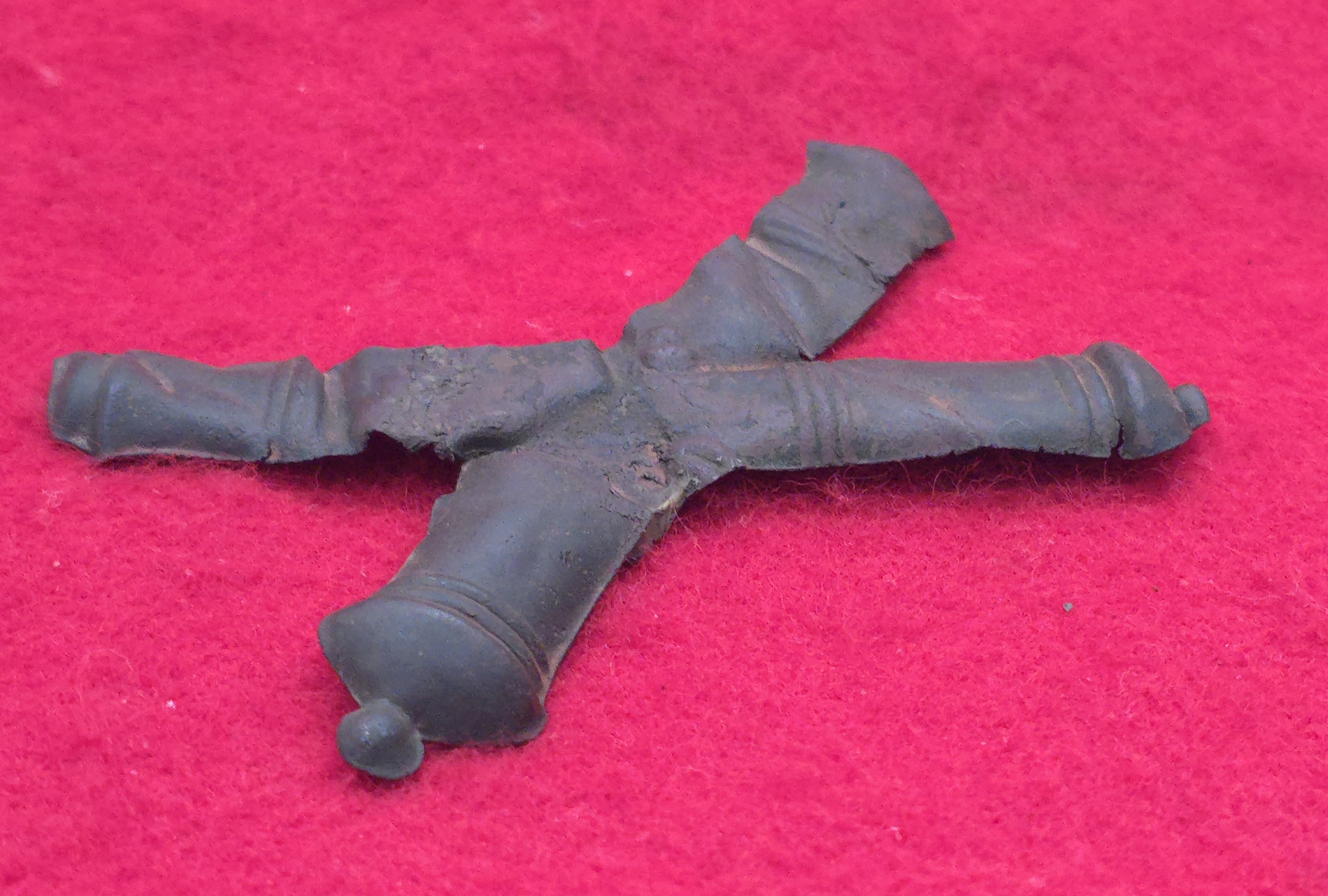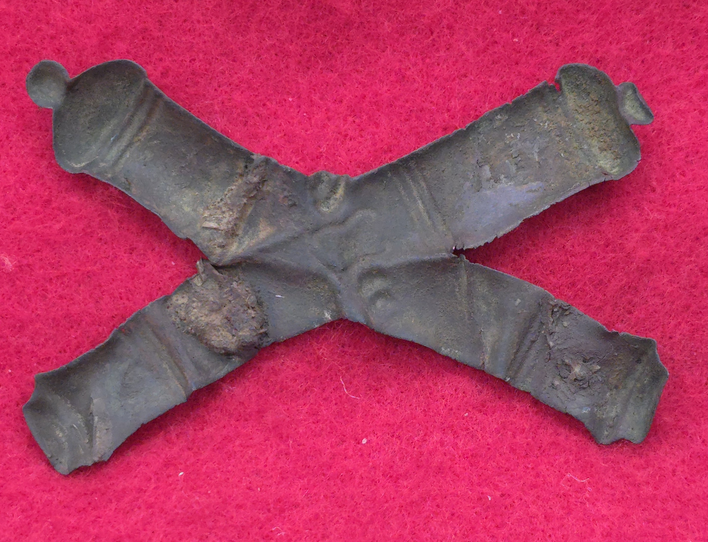 Civil War period Artillery hat insignia , dug at the Battle of Nashville, close to Shy's Hill, many years ago. Looks like it was bent or cracked when dug and digger straightened it and reinforced it. It is in solid condition. He did a great job on it and it displays beautifully. This is a great price on this one.