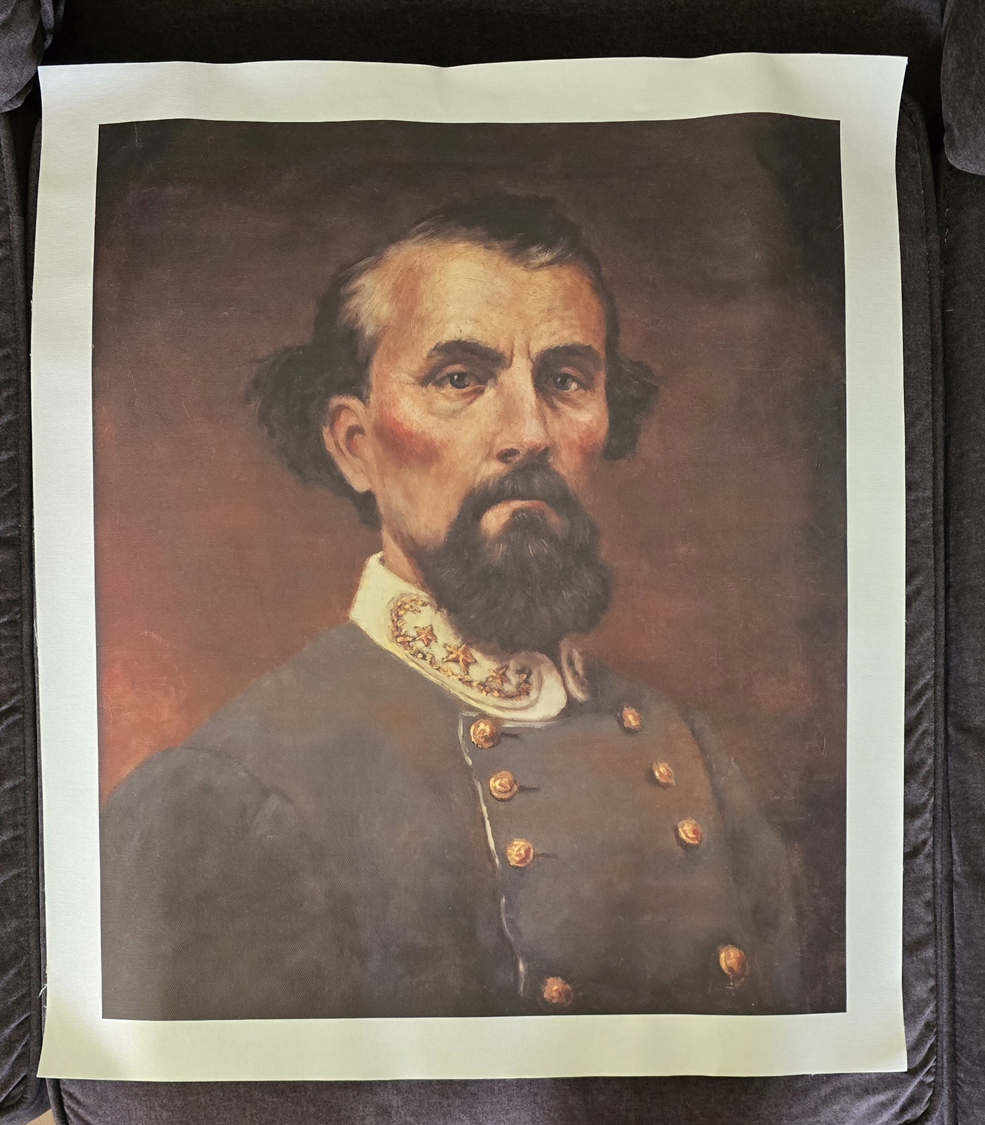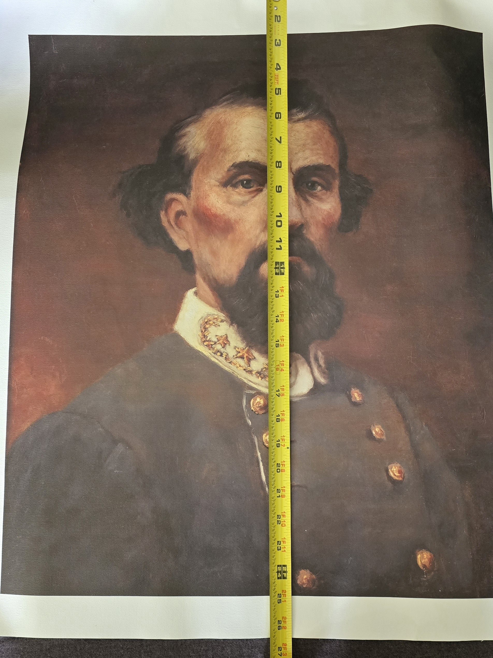 Very realistic looking canvas print of Confederate General Nathan Bedford Forrest . It is printed on real art canvas that makes it look like a real oil painting. Really looks good framed , as shown in the pictures. I am offering this one as the canvas print only, due to the expense of shipping it framed. Canvas print only will ship for 10.00 shipping. Canvas dimensions are 22-1/2"×26-1/2" . Image dimensions are 19-1/2"×23-1/2" . Image is new and never framed. This is a very impressive looking print.