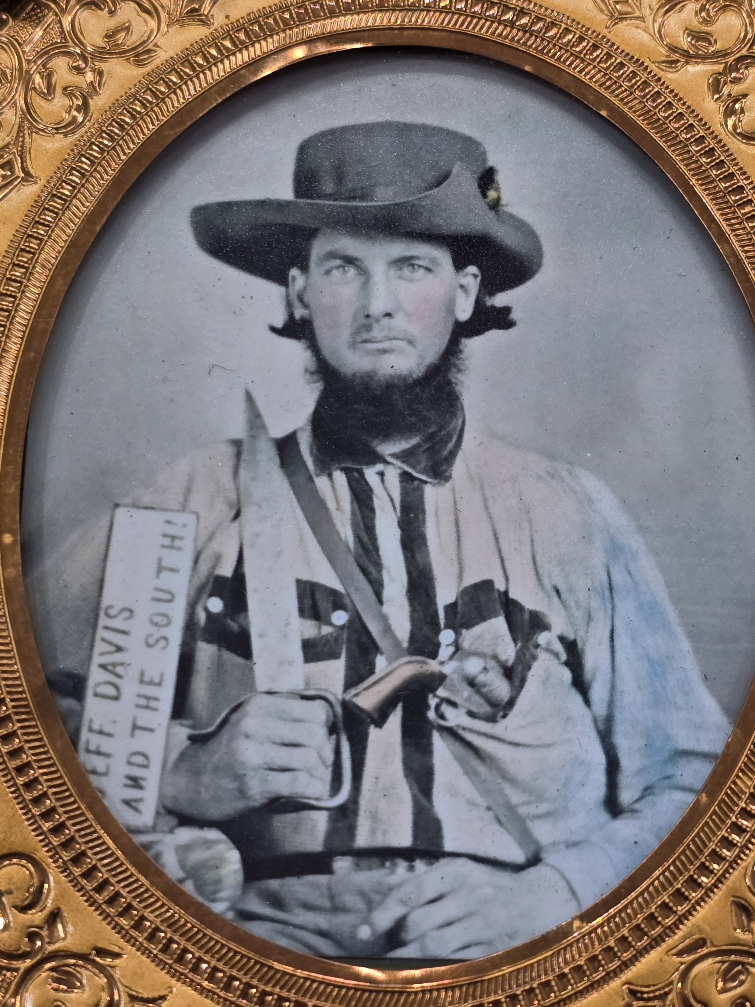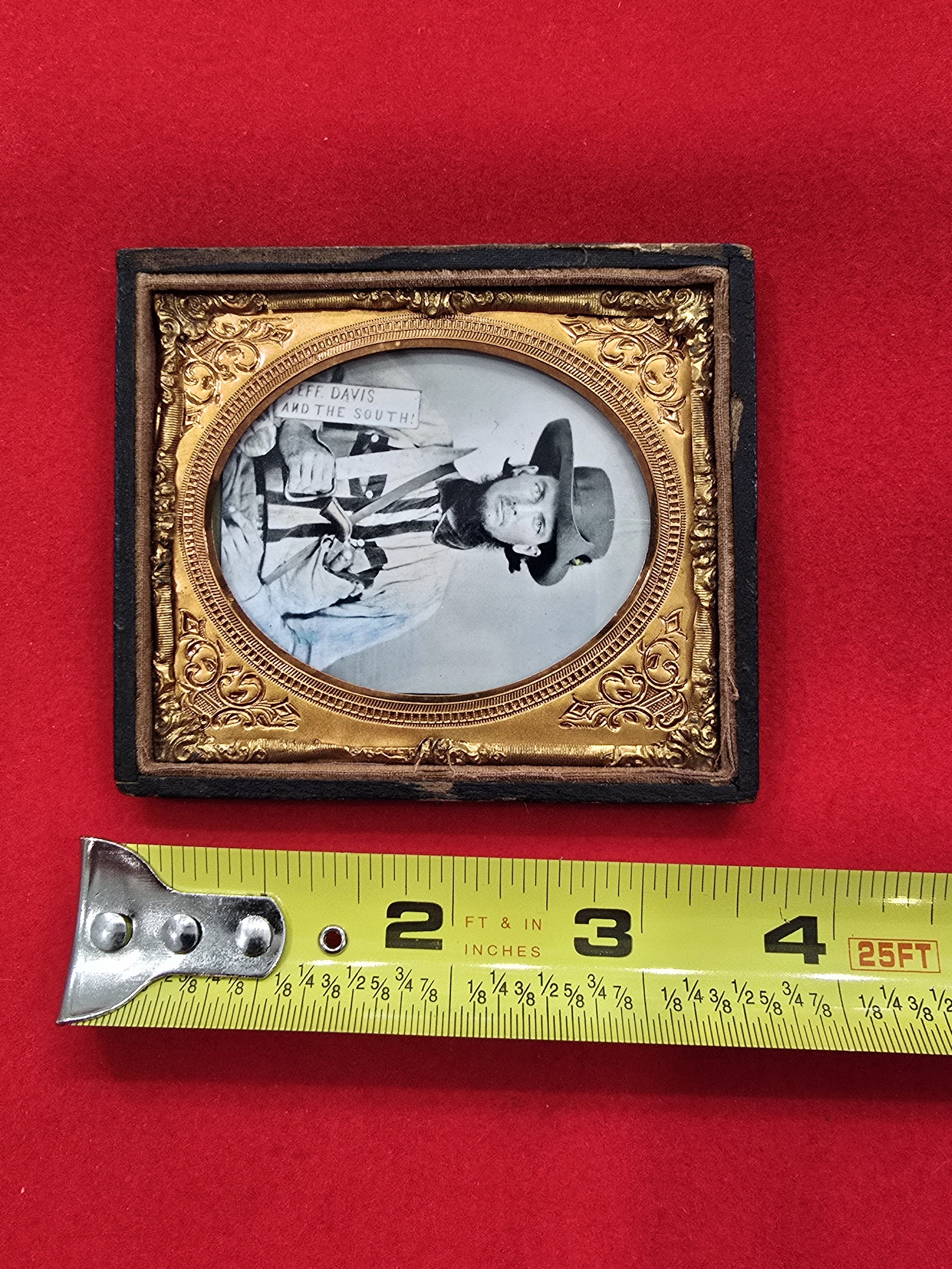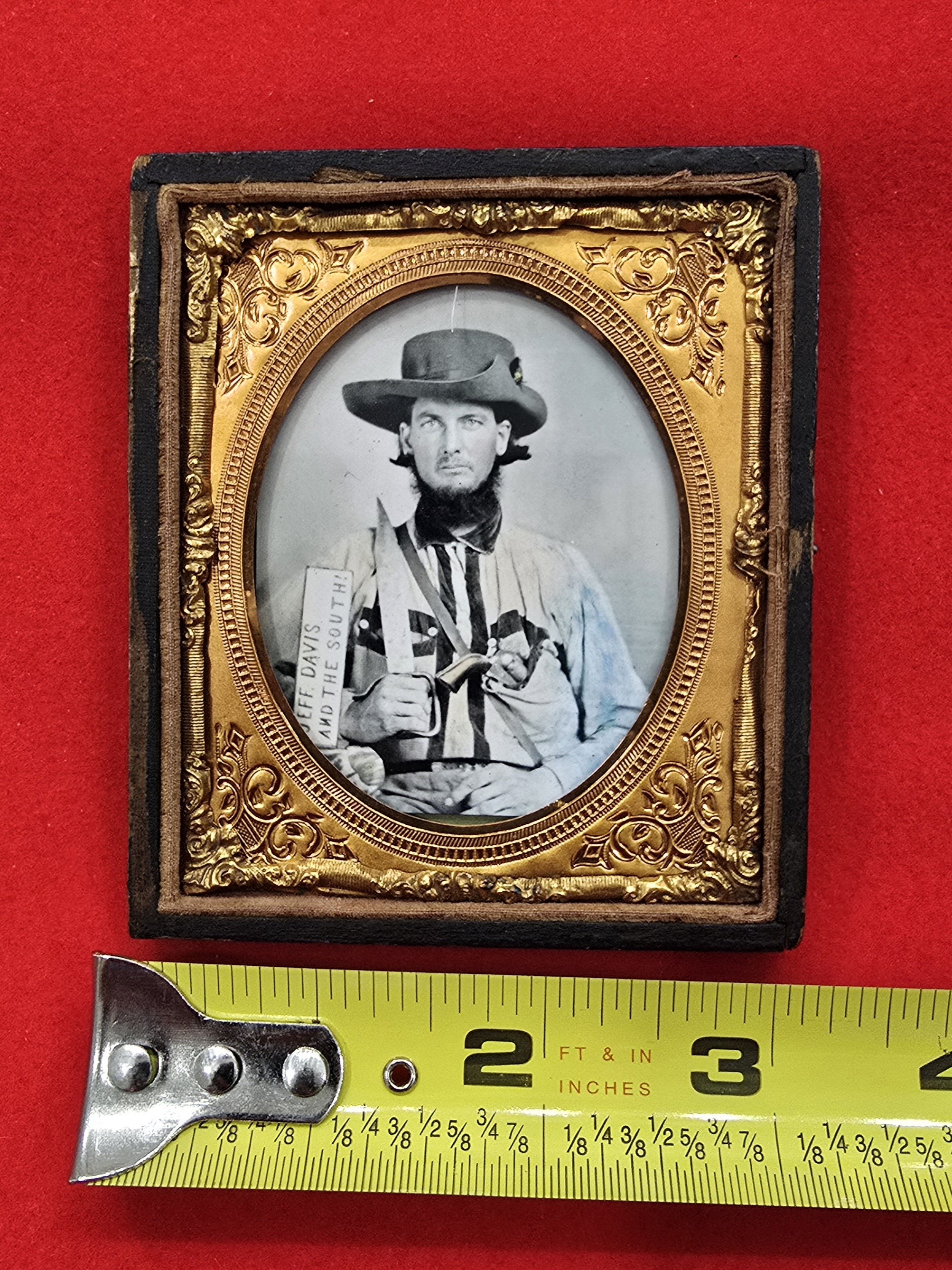 This is a cool reproduction of a Famous image depicting a Confederate soldier posing next to a sign with the popular battle cry " JEFF DAVIS AND THE SOUTH " . I have seen images of other soldiers posing next to this same sign , in the same photography studio The original pictures are believed to have been taken in Corinth MS. The original image would sell for thousands. This reproduction is in high resolution and looks very real , but the back is different, so it won't be sold as an original. Really looks good in the original Civil War period half case and will look great displayed with your relic collection at a cheap price that won't break the bank. 😁